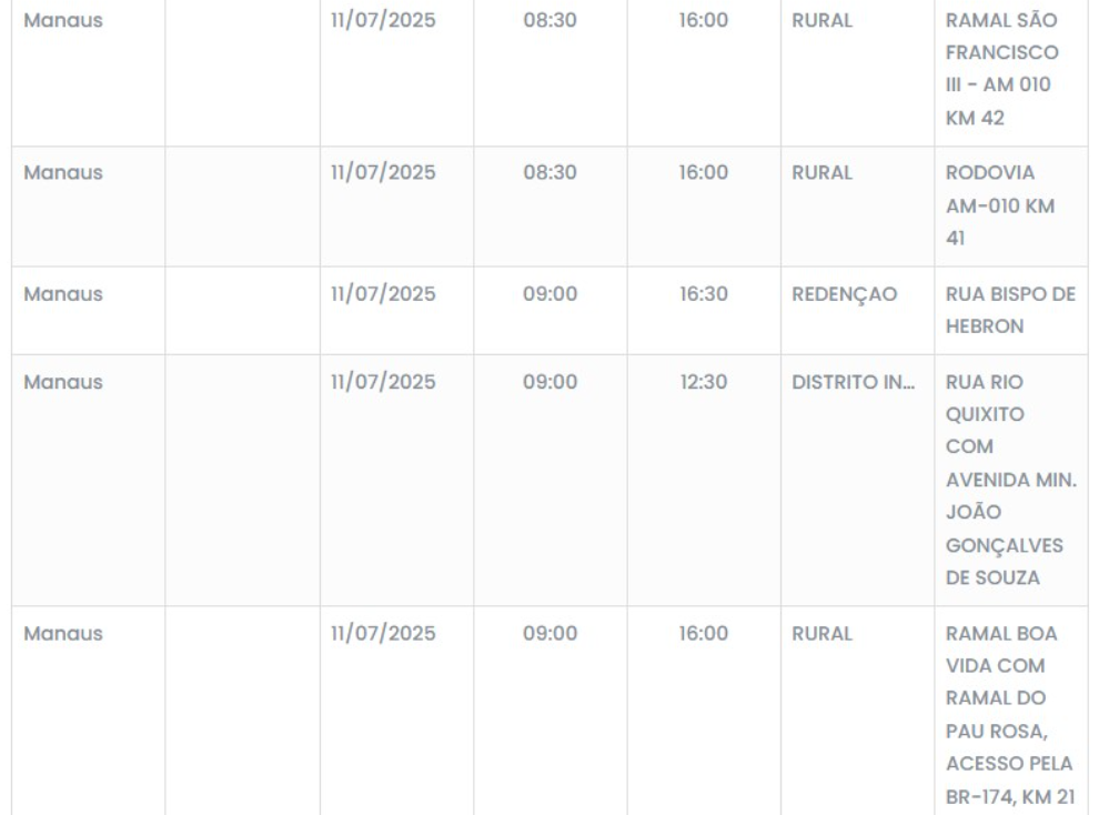 Além das áreas rurais, os bairros Redenção e Distrito Industrial também estão na lista dos locais afetados. Nesses bairros, as interrupções ocorrerão em endereços pontuais, conforme o cronograma de manutenção da concessionária.