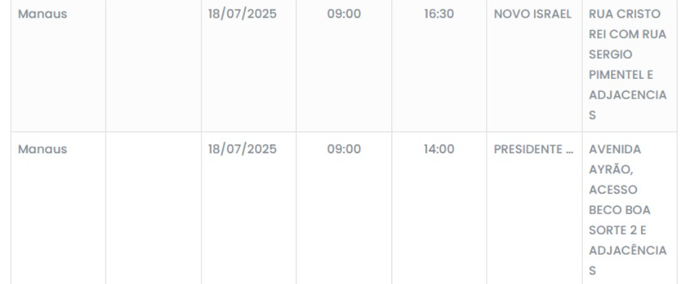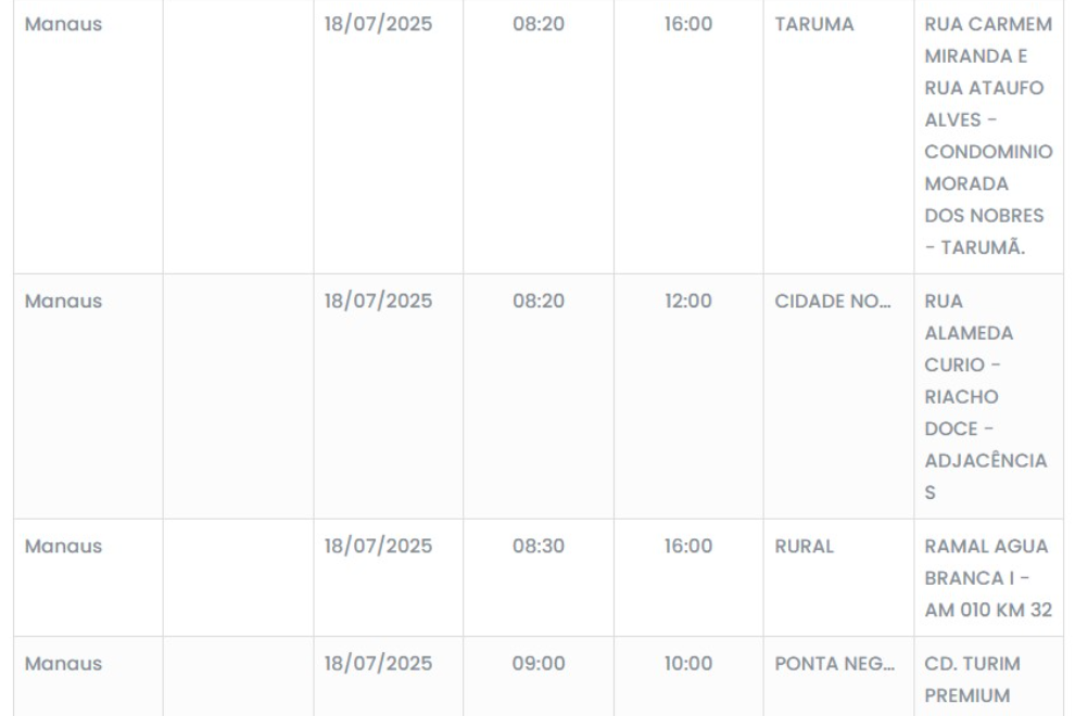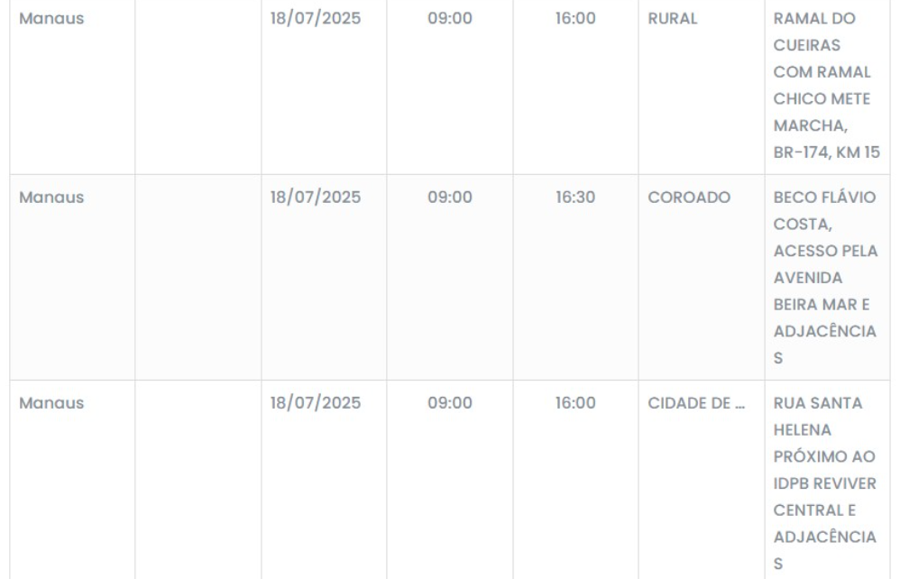 Para obter a lista completa dos bairros e as respectivas ruas e horários da falta de energia, os consumidores devem consultar os canais oficiais da Amazonas Energia, como o site da empresa ou seus perfis nas redes sociais.