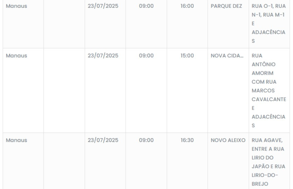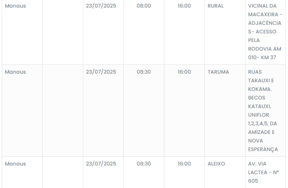A capital amazonense, Manaus, terá interrupções programadas no fornecimento de energia elétrica nesta quarta-feira, 23 de julho de 2025. Seis bairros da cidade, em diferentes zonas, serão afetados por manutenções essenciais na rede elétrica de ruas e avenidas.