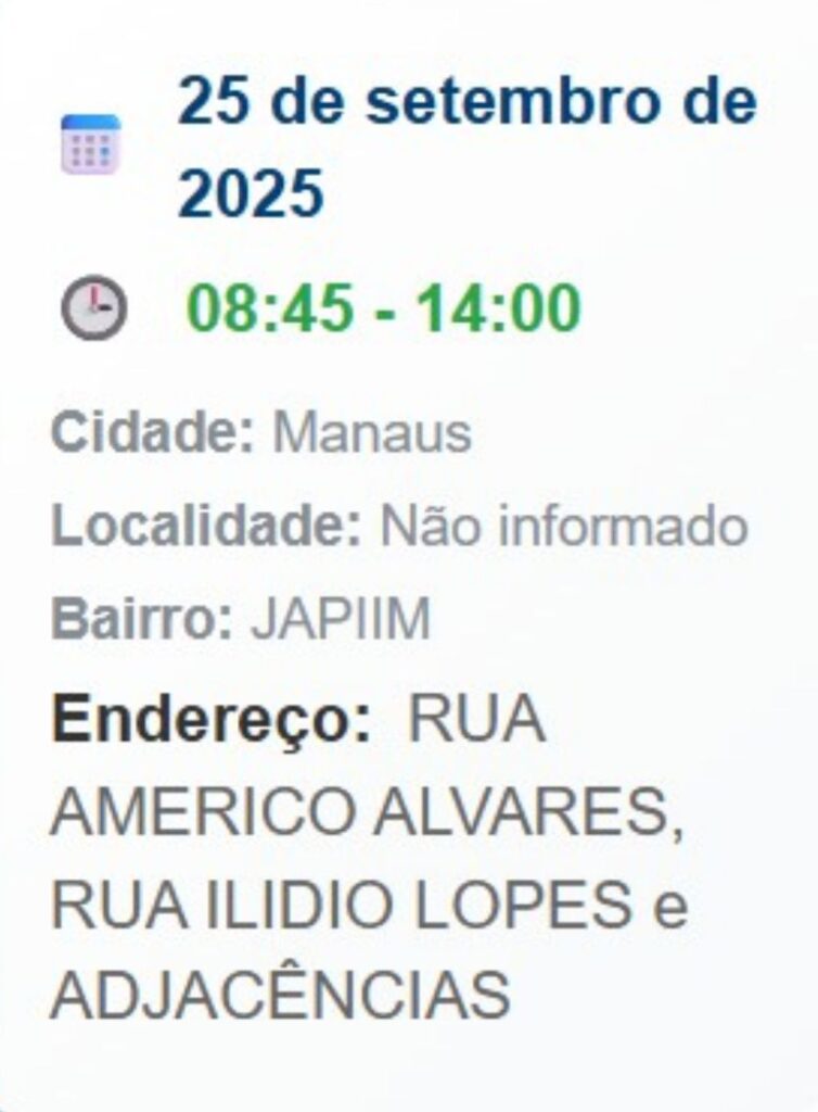 A concessionária de energia de Manaus programou uma manutenção que afetará o fornecimento de energia elétrica em quatro bairros da cidade nesta quinta-feira (25). Os moradores e comerciantes do Novo Israel, Tancredo Neves, Nova Cidade e Japiim terão o serviço interrompido.