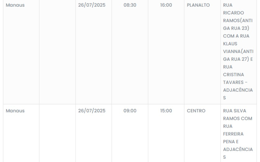 terão o fornecimento de energia interrompido neste sábado, 26 de julho, para a realização de serviços essenciais. A concessionária responsável comunicou os desligamentos, que visam aprimorar a qualidade e segurança da distribuição de energia na capital amazonense.
