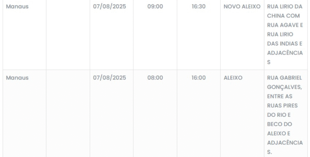 Três bairros das zonas norte, sul e centro-oeste de Manaus terão o fornecimento de energia interrompido nesta quinta-feira (7). O desligamento, programado pela concessionária de energia, faz parte de um cronograma de manutenção da rede elétrica da cidade.
