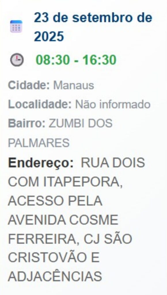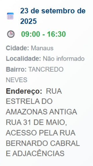 A concessionária Amazonas Energia informou que realizará manutenções programadas na rede elétrica em três bairros de Manaus nesta terça-feira, 23 de setembro de 2025. As interrupções são necessárias para a realização de serviços de expansão e melhoria da rede, visando garantir a segurança e a qualidade do fornecimento.