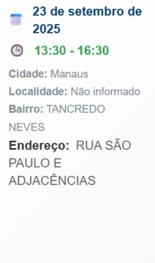 Três Bairros de Manaus terão fornecimento de energia interrompido nesta terça-feira (23)