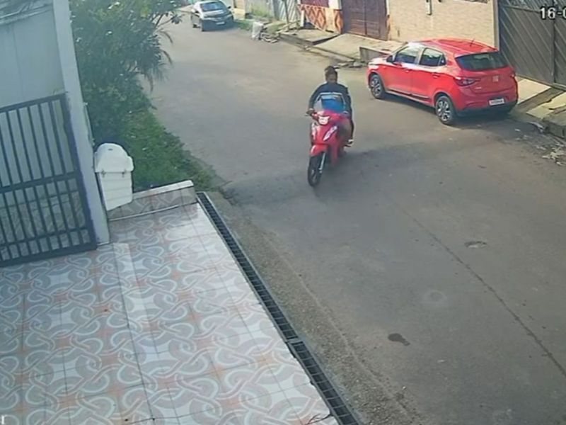 Câmeras de segurança registraram o momento em que um estudante foi abordado pelos criminosos enquanto se dirigia para a escola. O homem, que estava na garupa da moto, apontou uma arma para a vítima e roubou seus pertences de forma rápida, sem sequer descer do veículo.